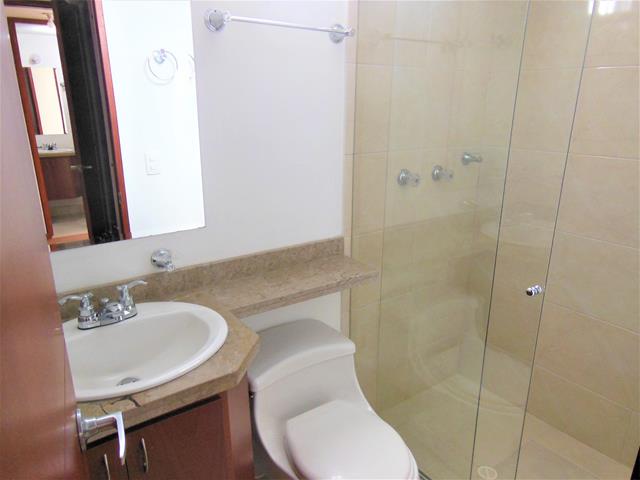Hall de Alcobas que conduce a las habitaciones garantizando mayor privacidad para las mismas, en el cual encontramos el Baño de Alcobas completo con ducha, ventana de ventilación, sanitario, mueble de baño en lavamanos y mampara de vidrio divisora de ducha en perfecto estado.